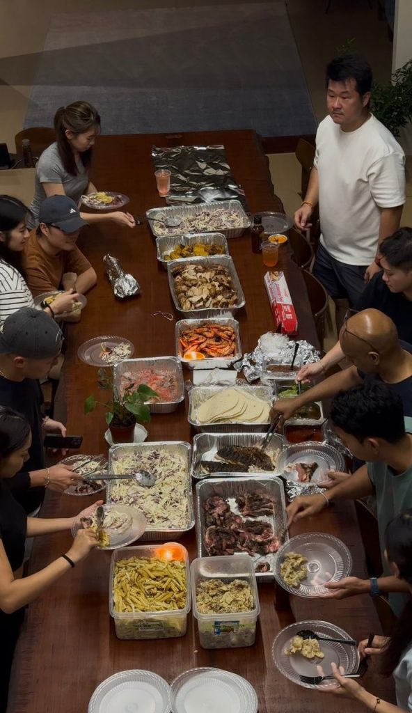 What came off that setup was a spread we were quietly proud of: prime rib and steaks, whole spatchcock chicken, seabass fillet, and prawns on the grill. Alongside them, bucatini aglio olio, chips with salsa, coleslaw, grilled corn, potato salad, and a fresh tongkol crudo to round things out.